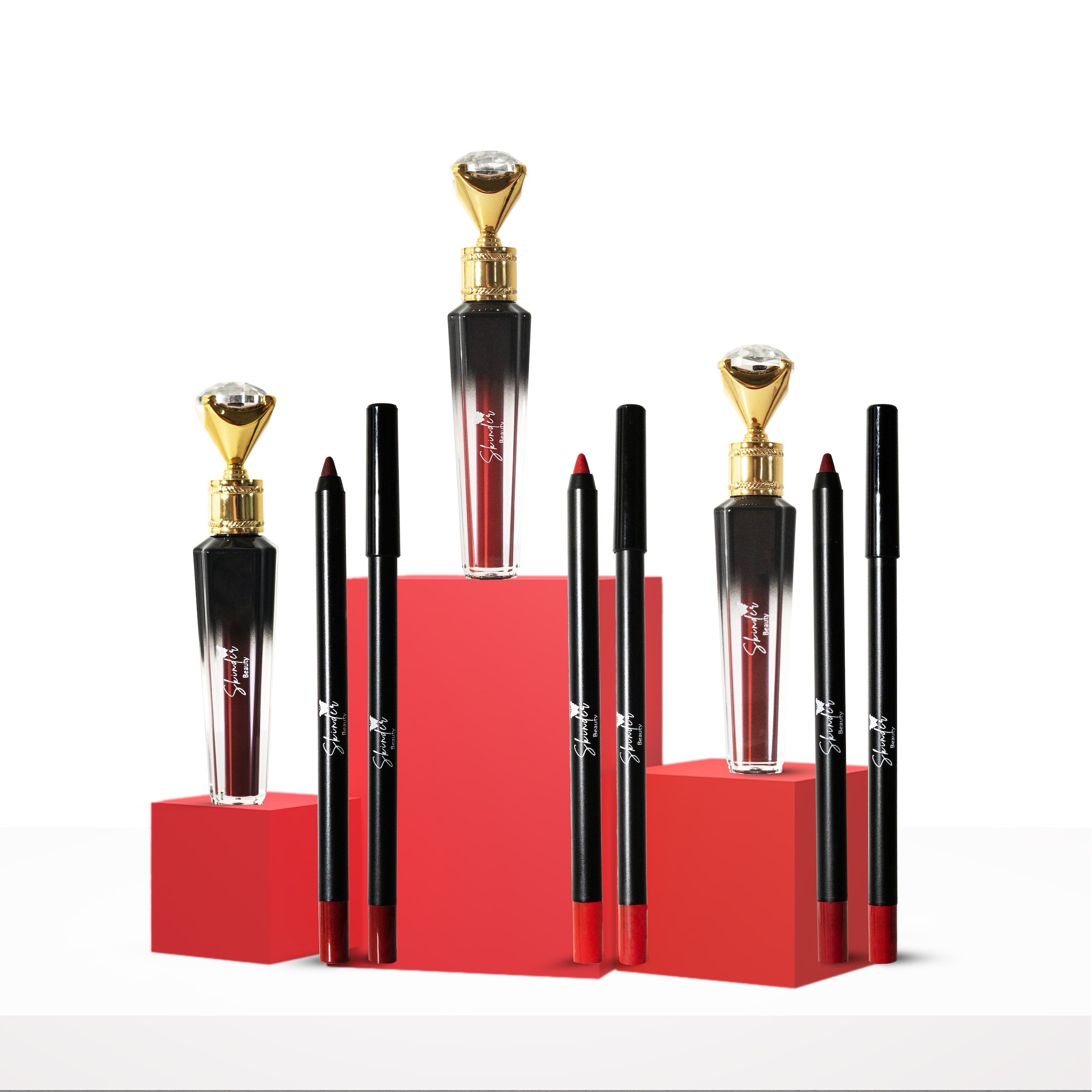 Skinder Beauty's Limited Edition Red-Set bundle. Featuring Evalavie, Evolved, Breaking limits Lipsticks & Happiness, Perfect Pout & Self Love Lip Liners that last for long
